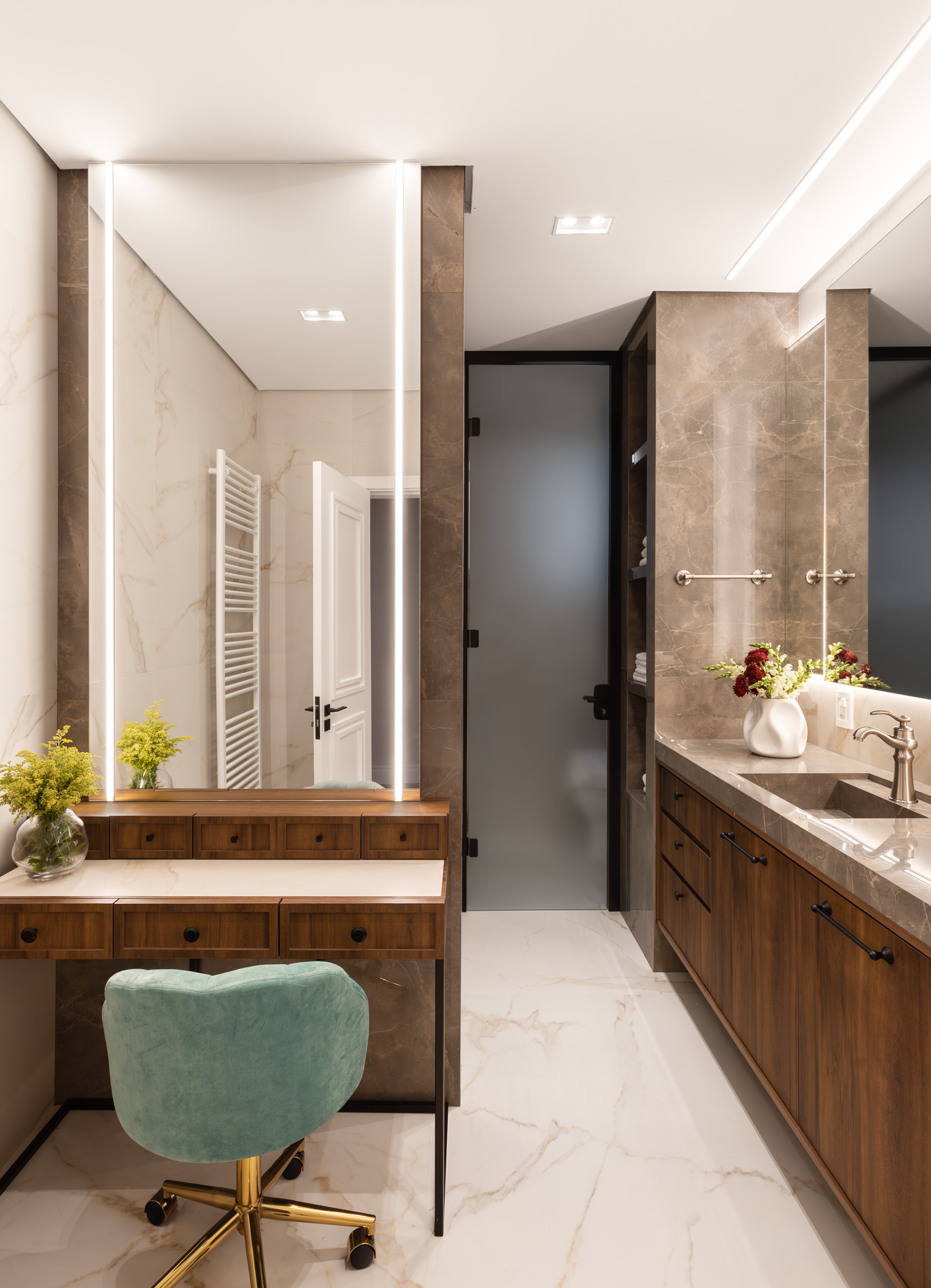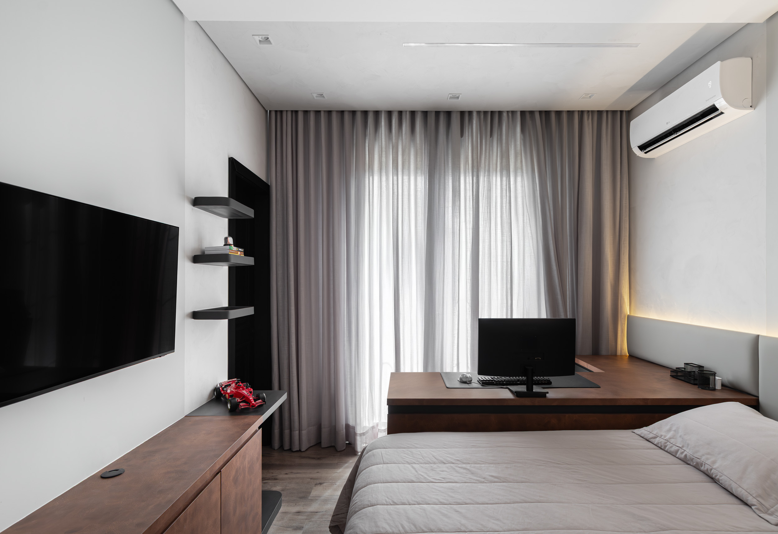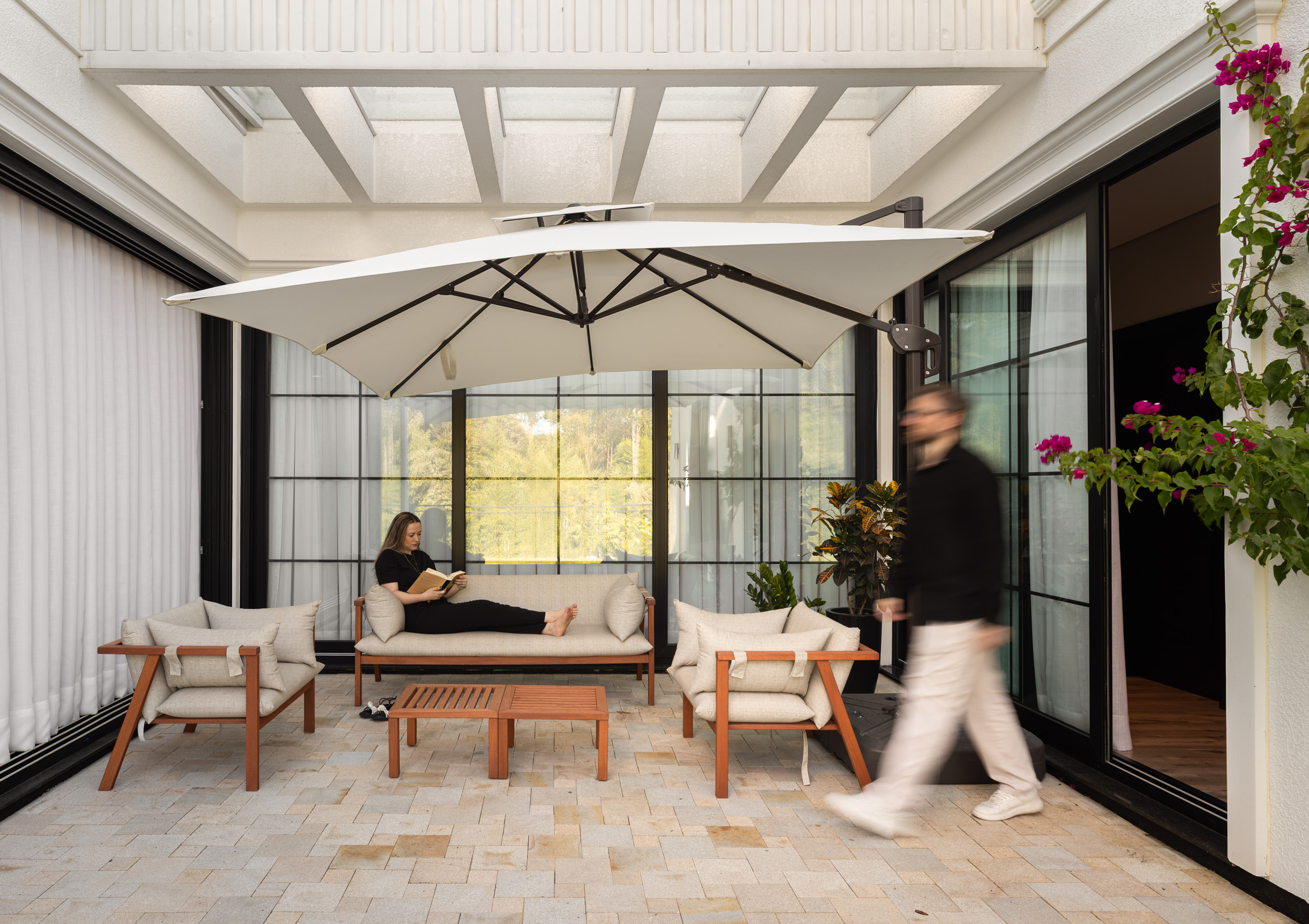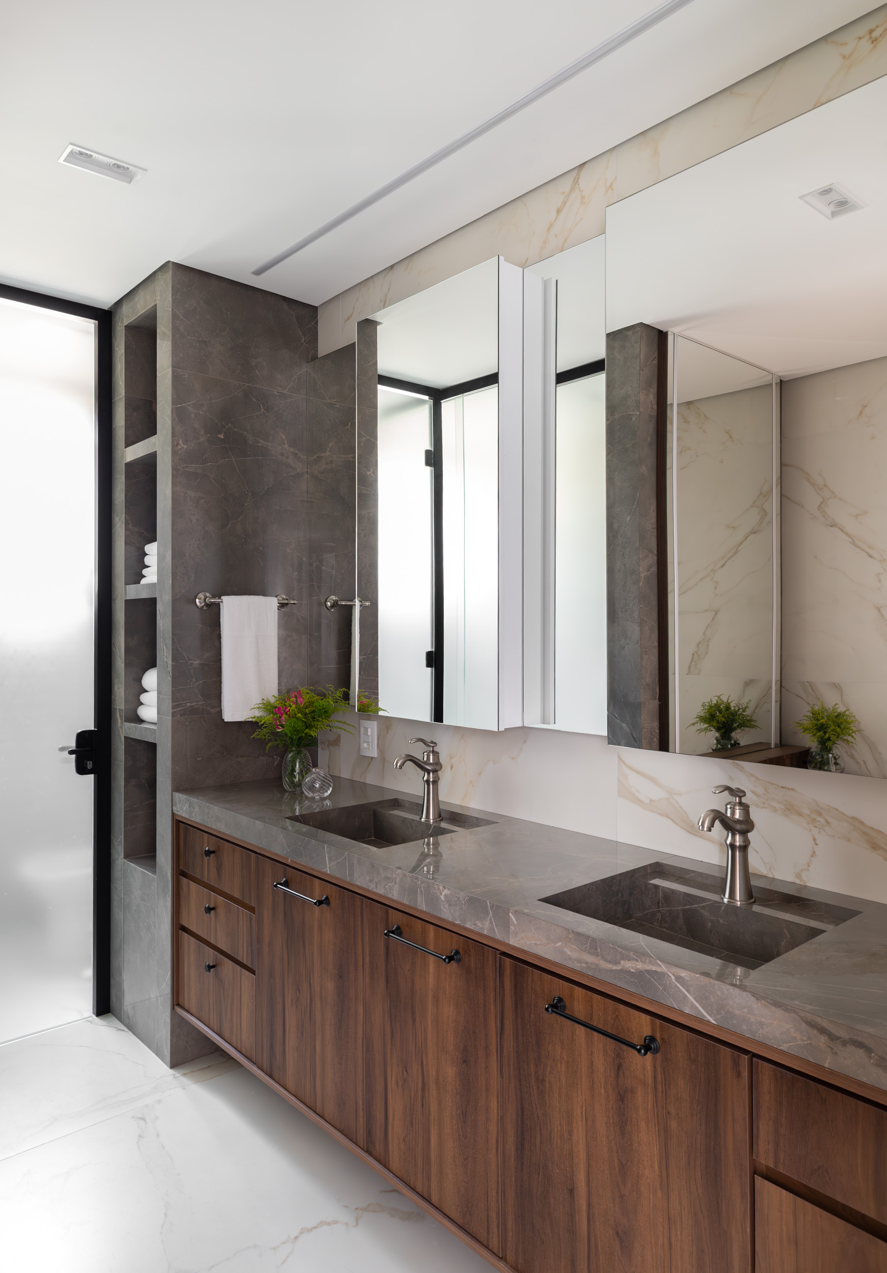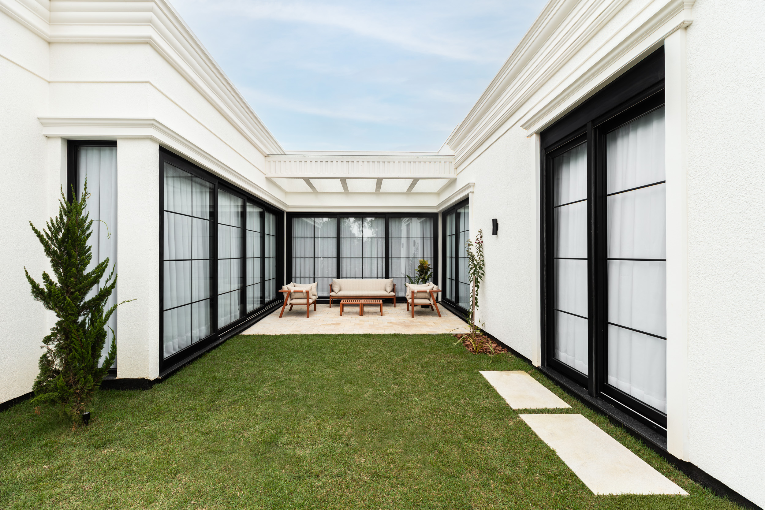 Localizada em um terreno com desnível, os amplos espaços dessa residência foram planejados para proporcionar conforto e privacidade a cada membro da família, ao mesmo tempo em que incentivam o convívio e o compartilhamento de momentos especiais.